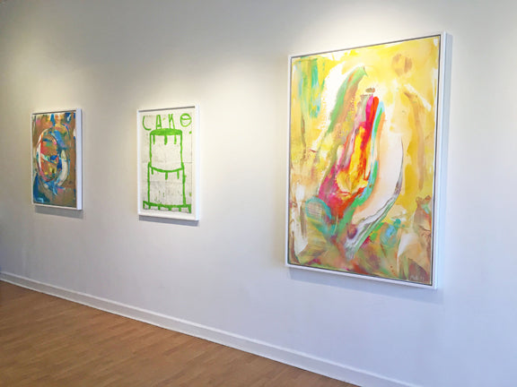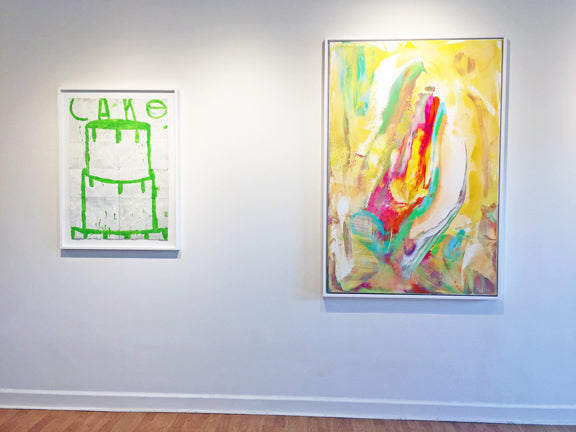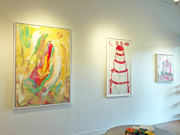 Gary Komarin is known internationally for his bold and colorful style of painting most associated with post-painterly abstraction. His artwork lives on the border between image and abstraction incorporating a child-like visual vocabulary. According to Komarin, the best paintings "paint themselves." Using a fusion of house and oil paint, spackle, and other assorted mediums on rough paper bags and envelopes, Komarin's beguiling Cake paintings are placed front and center. Sometimes they lean like the Tower of Pisa, while dripped frosting showcases Komarin's playful manner and charm. Komarin credits his mother's cake baking, as well as his father's career as an architect, as the genesis for this imagery, which has been described as "a marriage between the domestic and the architectural."