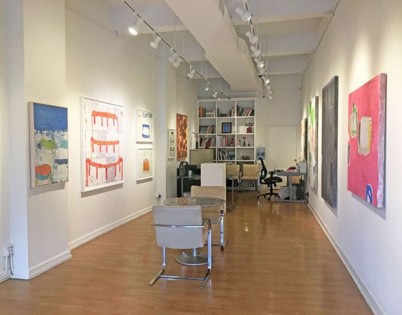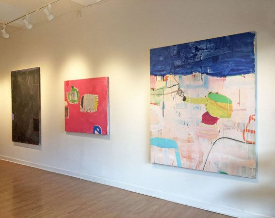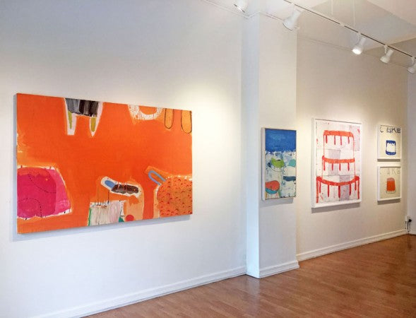 Included in the exhibition are seven oil paintings and four works on paper all completed in the past year. Komarin is internationally recognized as a risk taker of contemporary painterly abstraction. An artist who has forged a singular style over 30 years of painting, Komarin’s free-wheeling works have a deep connection to Color Field and Ab-Ex painting, and the current trend of Provisional painting. Utilizing unconventional materials, such as house paint, spackle, and industrial canvas tarps, Komarin’s roughly textured, intuitive paintings feature an assortment of oddly shaped forms and iconography – that may or may not appear recognizable – on large flat fields of solid color. He states “I think of my paintings as pre-linguistic. Forms travel and co-mingle through time and space, free from the tyranny of order and reason.” Â
