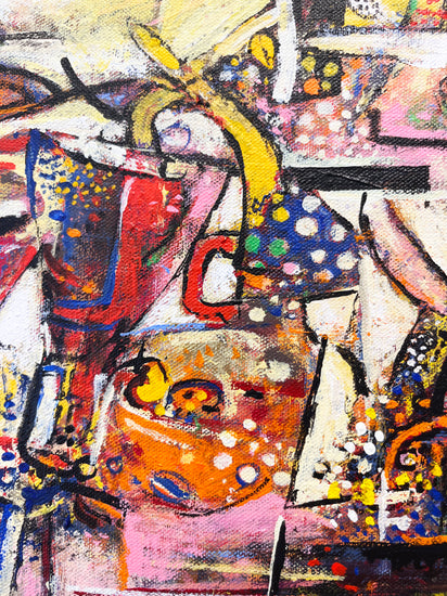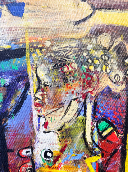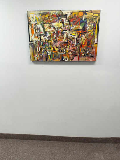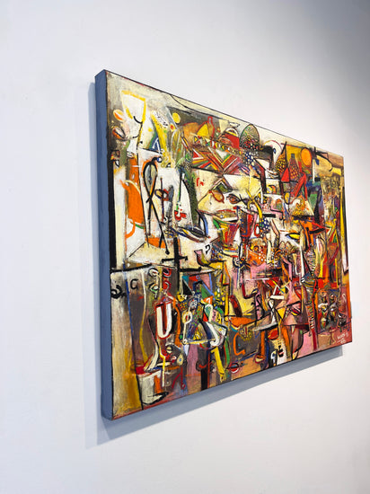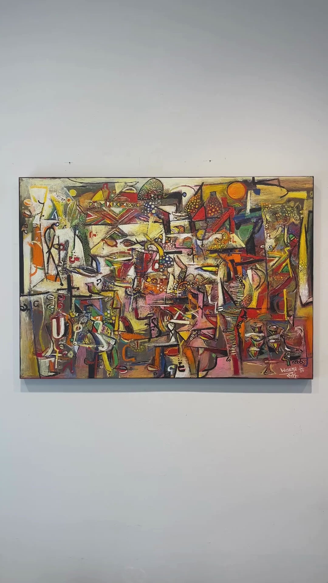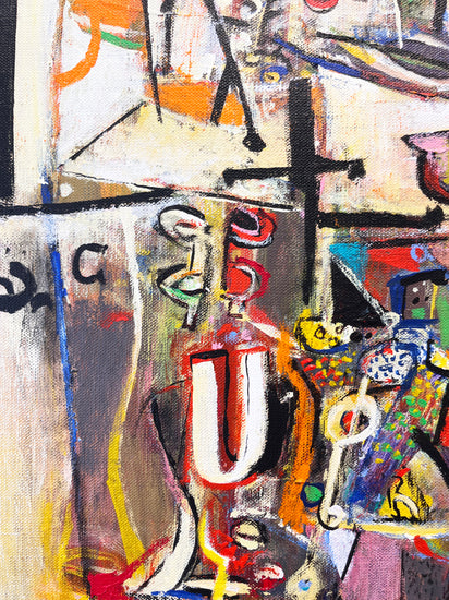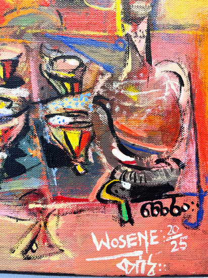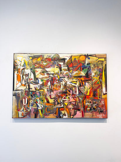 Wosene’s canvases are multi-layered with paint and imagery, but he is best known for his ingenious use of the Amharic script, one of the world’s oldest languages, and is the first Ethiopian-born contemporary artist to incorporate these symbols as a root element in fine art paintings. The artist elongates, distorts, and assembles letters into forms of universal appeal beyond their linguistic meaning. There is rich dialogue between the simplified letter forms and symbols that are intensely worked creating color-drenched textured surfaces of visual power. American jazz improvisations are evident in the active syncopation of the surface of many Wosene paintings. Fractured images of jazz instruments, musical notes, and strings can be found amongst household objects and figures as well as layers of paint, recalling the overall whimsical and joyful compositions of jazz.