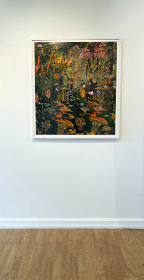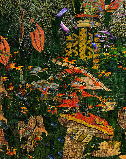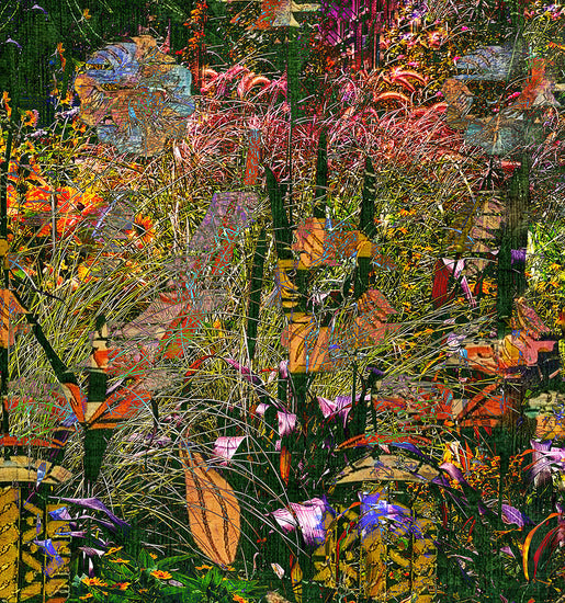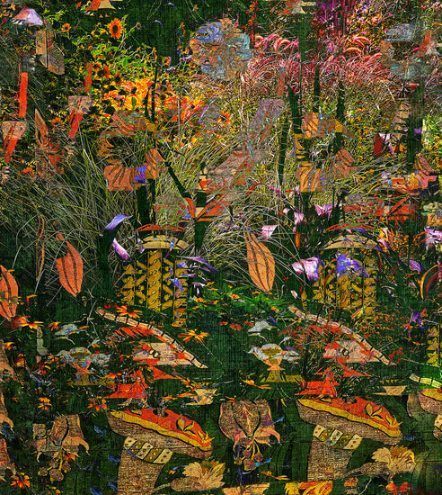 This manipulated digital photomontage features a closeup view of a forest with a variety of flowers and plants.
