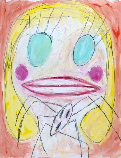 ADAM HANDLER (b.1986) is an American contemporary artist whose work draws from a faux-naïf aesthetic, a style marked by its intentional simplicity and sincerity. Using oil sticks to produce bold lines, vibrant colors, and textured compositions, he achieves an almost childlike directness that belies the deeper, layered narratives of love and loss within each composition. Handler's works embody a deep personal reflection, exploring themes of love, family, and the longing for connections with those he has lost. Through whimsical scenes featuring ghostly figures, he invites viewers to connect with the delicate balance of lightheartedness and sorrow. Handler's vibrant female figures, inspired by the abstract forms of Willem de Kooning, embody his own playful, yet reflective perspective on memory and presence. These figures maintain a raw simplicity that speaks to childhood innocence, which captures the fragile beauty of connection and loss, blending personal memories with universal themes of love and family.