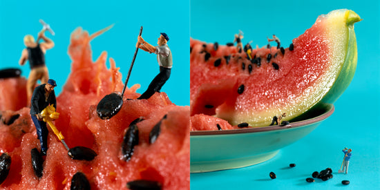 Akiko Ida and Pierre Javelle "Les Minimiams" combine photography, magical landscapes, culinary backdrops, and portraiture to create settings inhabited by diminutive characters, referred to as minimiam. Each diptych reveals to the viewer a whimsical land that plays with our minds, as well as the subject.