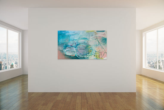 After relocating to the United States, Kern began to cultivate her distinctive style. While initially focused on richly layered abstract compositions, she noticed that images of water lilies started to surface naturally through her exploration of lines and shapes. The water lily soon became a recurring motif—less a literal subject than a means to investigate light, movement, and spatial ambiguity. Kern works primarily with cold wax, a medium she favors for its creamy, tactile quality. Through her process of layering, scraping, and dissolving pigments, she allows forms to emerge intuitively, blurring the line between abstraction and representation.