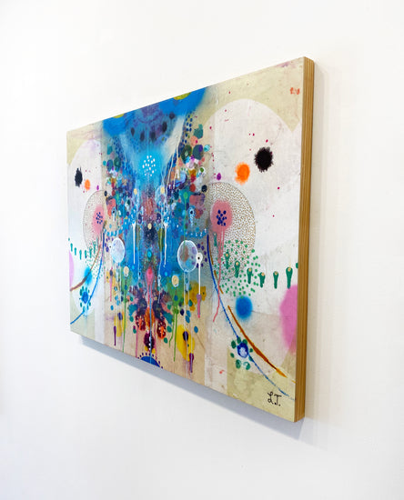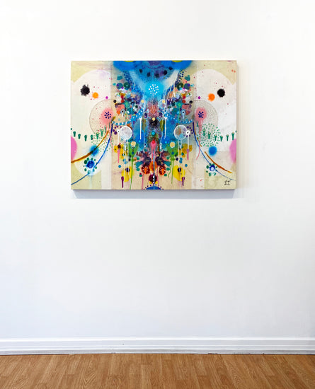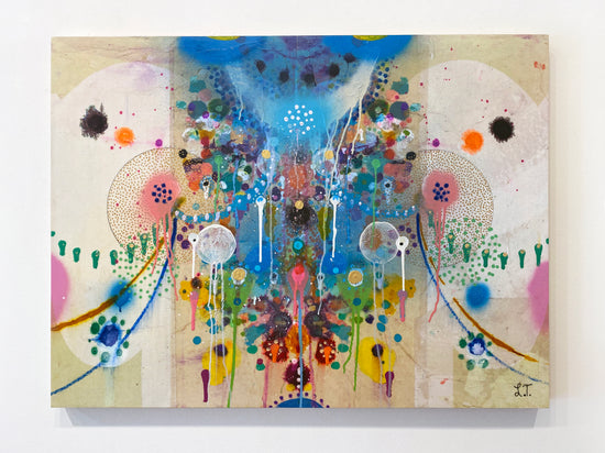 Abstract, colorful, mixed media painting influenced by Rorschach inkblot tests. Composed of ink, acrylic, graphite, and beeswax. The active surface is in bold colors of red, orange, yellow, blue, green, purple, pink, white, and black on a beige background.