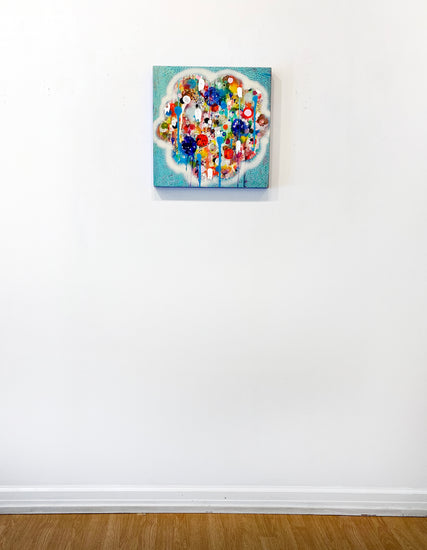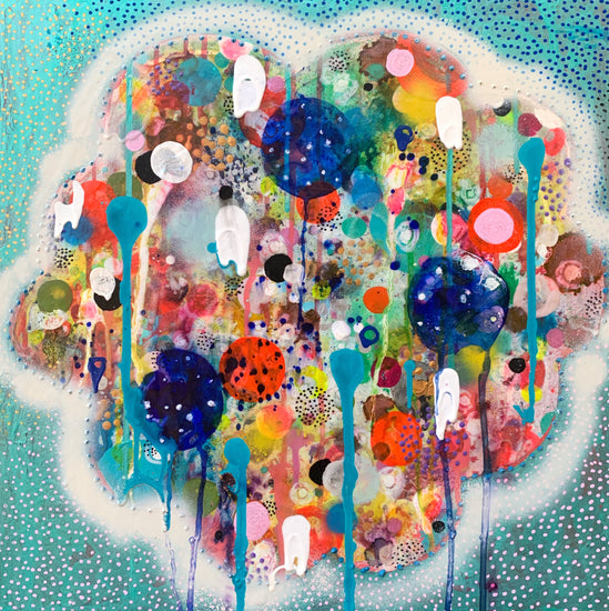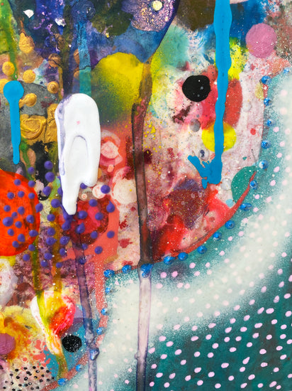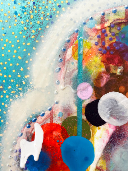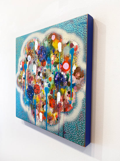 Abstract, colorful, mixed media painting influenced by the artist's attempt to turn depressing weather into something more joyful and vibrant. Composed of ink, acrylic, graphite, and beeswax. The surface is adorned with bold colors of blue, pink, purple, green, yellow, and white on a blue background.