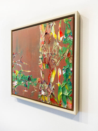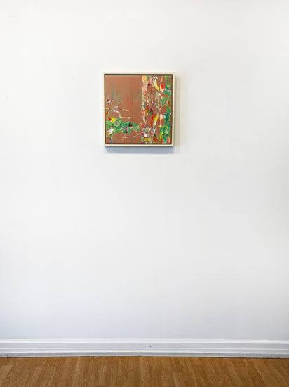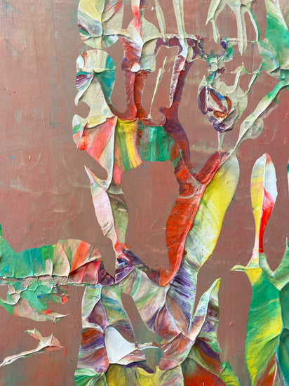 This abstract painting utilizes thick, animated brushstrokes of acrylic paint. The active surface of the canvas incorporates bold colors in green, yellow, orange, and white on a matte salmon colored background.