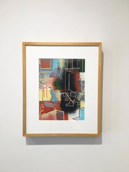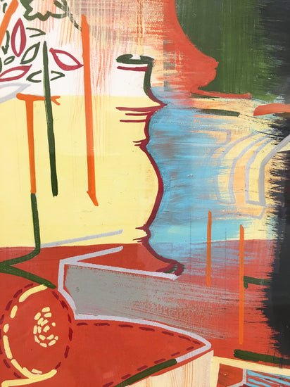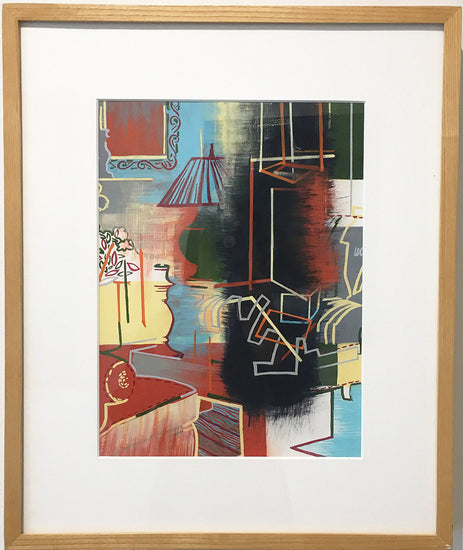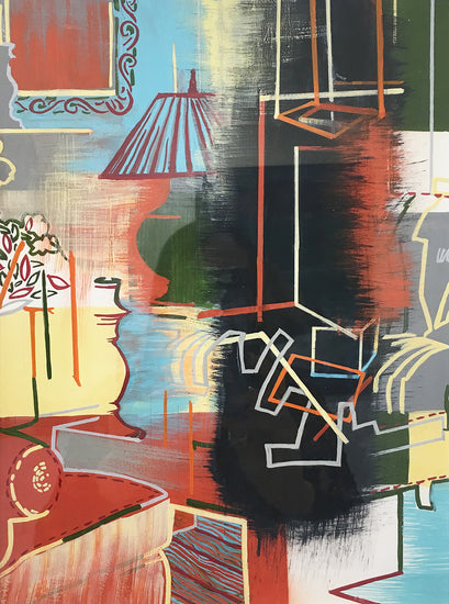 With her works on paper, Jean Blackburn begins with images scanned from various home furnishing catalogs (Pottery Barn, Crate and Barrel, Williams and Sonoma, etc.) and interior design magazines. Once printed, the images are then modified with layers of silkscreened line drawings and hand painted elements in gouache. The artist is fascinated by the carefully constructed, highly marketable realities the catalogs present. The intimate facades, embedded with preconceived values and narratives, allow us to construct or maintain our identities and self-perceptions which give form to larger cultural forces such as fashion, class structure, economic and social status, and global marketing.